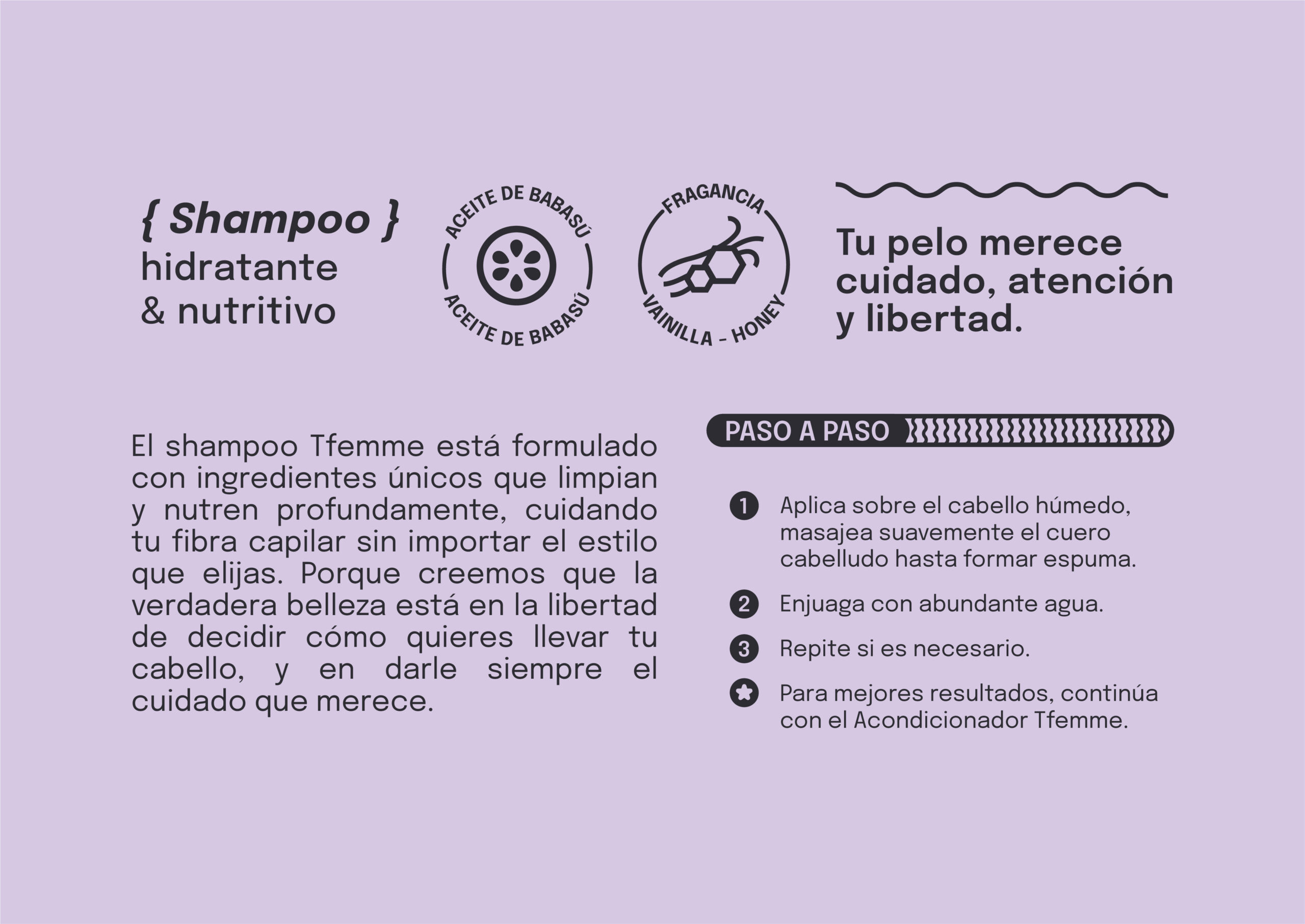 El shampoo Tfemme está formulado con ingredientes únicos que limpian y nutren profundamente, cuidando tu fibra capilar sin importar el estilo que elijas. Porque creemos que la verdadera belleza está en la libertad de decidir cómo quieres llevar tu cabello, y en darle siempre el cuidado que merece.